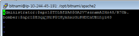 bitnami@ip-xxx-xxx-xxx-xxx:/opt/bitnami$ sudo /opt/bitnami/apache2/bin/htpasswd -c /opt/bitnami/repositories/users bomber New password: Re-type new password: Adding password for user bomber |