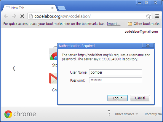 svnadmin 명령으로 repository를 생성한다. (이름은 codelabor 로 정의함)